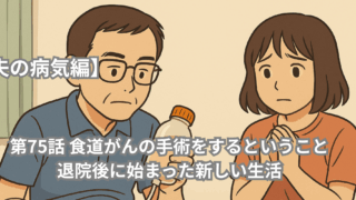 夫の病気 【夫の病気:第23話】食道がんの手術をするということ〜退院後に始まった新しい生活 <この記事は広告・プロモーションを含みます>想像以上に大変な日々きゃんばぁば夫が退院してからの生活は、想像していた以上に大変でした。抗がん剤の治療の時とは全く異なり、日常生活の一つひとつに工夫や我慢が必要になりました。想像以上に大変だと実感... 2025.09.17 夫の病気